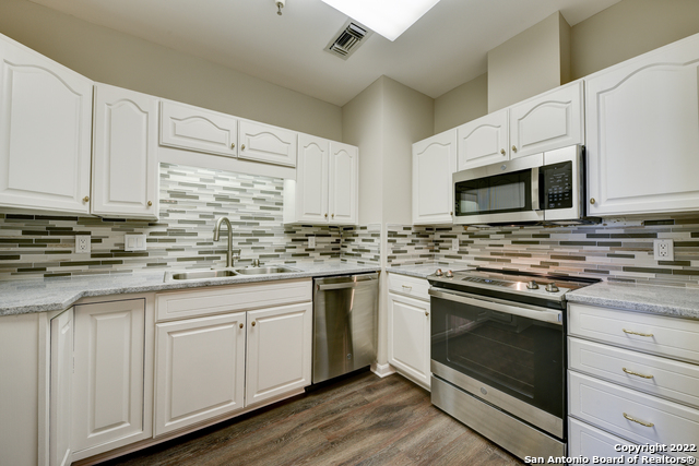Thoroughly redone 2 bedroom unit with 19th floor views of San Antonio's northside at an amazing price! New interior paint, flooring, counter tops and "bowl sinks" in baths! Hall bath has roomy, step-in shower. "Decor" switches. Crown molding. Gorgeous kitchen with stainless steel appliances (including dishwasher, microwave, smooth top self-cleaning stove/oven), solid surface countertops, custom cabinets (including pantry, lazy Susan & pull out drawers) & glass tile back splash. And that view of the entire north side! Spectacular!