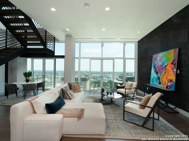 The Chopin at the Arts Residences is a two-story Penthouse with 12 ft floor-to-ceiling windows and designer finishes. This residence has an expansive living area and a wet bar for entertaining. The large walls are made to showcase art. Views to the North and South provide both tranquility and downtown energy. Located above the Thompson Hotel, amenities like 24-hour concierge, valet parking, and optional housekeeping and linen service offer a low-maintenance lifestyle. The kitchen has Gagganeau appliances, Italian Pedini cabinetry, an extended porcelain backsplash to the ceiling, a walk-in pantry, abundant cabinet space, a great island with porcelain countertops. Near the kitchen, there is a large area perfect for cooking prep, catering staff, or a great wine room. Enjoy amazing views while cooking, or take advantage of 24-hr room service from LandRace, run by James Beard Award finalist Steve McHugh of Cured. The bedrooms are located off of a long hallway that is another great opportunity for an art gallery. The primary suite has downtown views and two separate baths with heated floors, a large jacuzzi tub, a Toto toilet, and generous closets. A sitting area with sliding glass doors offers fresh air while you enjoy morning coffee or cocktails to watch the city light up. There are two spacious guest rooms, both with ensuite bathrooms and amazing closets. A study separates the two guest bedrooms and would make a great movie theater, meditation room, or cozy library. Another flex space at the end of the hallway with direct downtown views and a full bath could be used for a Peloton, art studio, or even as space for a live-in. Downstairs would make a breathtaking entryway with space for a piano, or a second living area with sliding doors that open to enjoy a cigar or fresh air. This residence comes with a private, enclosed 3-car-garage and is wired for speakers, smart home technology, and electric shades throughout. Residents have full access to the Thompson pool with cabanas, bar, and cafe. The hotel spa has a steam room and sauna and offers in-home massages. Other services available include dog walking, car detailing, personal shopping, housekeeping, linen service, and dry cleaning. While LandRace offers riverside seating downstairs, The Moon's Daughters has rooftop dining and cocktails upstairs. Located on a quiet part of the river next to The Tobin Center for the Performing Arts, residents enjoy preferred access and ticket purchases to all shows at The Tobin. Come experience The Art of Living Beautifully.