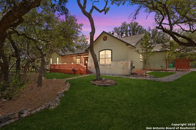 Looking for the Tranquil life? This home is located in a cul de sac towards the back of the neighborhood in the gated community of Lantana Ridge, Spring Branch TX. The views are jaw dropping! Appreciate the resort like feel. Must take the drive out to appreciate. TWO lots (26 &27) to total 5.33 acres. Open Floor plan offers great entertaining space - spacious kitchen overlooks 2 eating areas and oversized family room. Kitchen boasts - new cooktop, solid countertops, and custom cabinets with pullouts. Enjoy relaxing sunroom to view the great outdoors! Family room has attractive rock fireplace for those cooler Texas evenings. Privacy to master suite with a split floorplan as two additional bedrooms are located on opposite end of the home. Plenty of storage through out the entire home and ample closet space too. Welcoming and Spacious formal and casual eating areas and extra seating at the kitchen bar. Fenced backyard and garden area, two storage sheds and plenty of Texas size acreage to roam! Tile and luxury vinyl plank flooring - no carpet. Peace and serenity abound from the moment you proceed to the winding private driveway leading to oversized side entry garage. Easy access to highways, modern conveniences 10 minutes - restaurants, shopping and medical. Quick highway driving means 20-25 minutes in to San Antonio. Roof 2017, Septic serviced 2025. Time to own some land in Texas and a one story home!