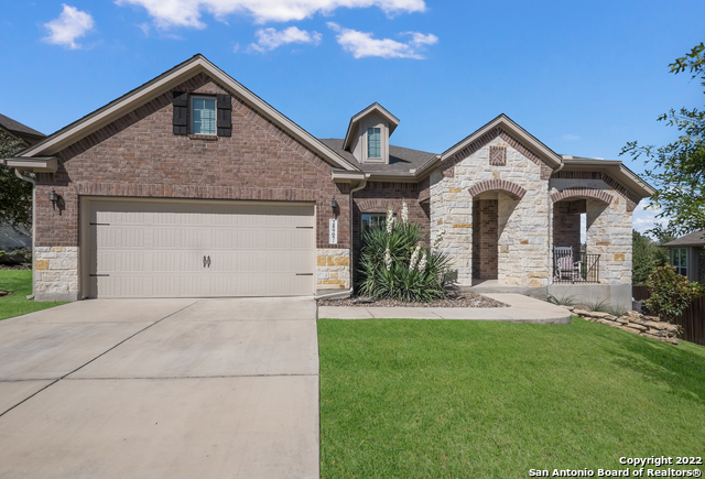 This remarkable 4 bedroom, 3.5 bath home in the highly desirable neighborhood of Kinder Ranch, is nestled on a private .24 greenbelt lot with mature trees. The covered front patio and elegant brick/stone exterior welcome you immediately. Upon entry you are greeted by beautiful hardwood floors in the dining room and spacious study, which could easily be another family room or home office. The sizable kitchen boasts an oversized island with bar seating, 42" espresso cabinets, stainless steel appliances, gas cooking, and granite countertops. Abundant natural light fills the expansive family room and eating spaces in this one of a kind open floor plan. The owner's suite welcomes you with wood look tile flooring, tall ceilings, and a bathroom with a luxurious, separate standing shower, double vanities, and three closets! A fourth bedroom upstairs that could also present as a fun game or media room, includes a full bathroom with an expansive closet that provides access to the home's second attic space. There is also a utility sink in the laundry room with a refrigerator that will stay with the home. You'll enjoy your morning coffee and the view as you watch deer while sitting on the large covered back patio. Wonderful neighbors, easy access to 281, and zoned in acclaimed Comal ISD schools, including the new Pieper Ranch High School! Welcome home!