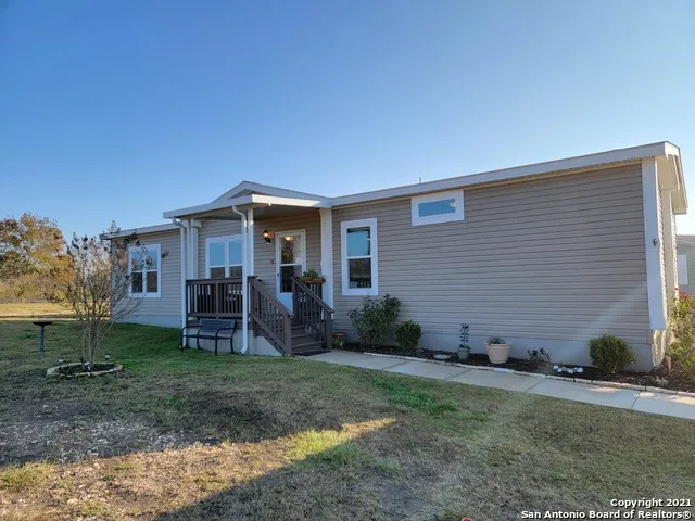 The owners had this home custom built with upgraded features in 2019! There is no carpet and the walls are drywall instead of the unsightly wall strips. Open floor plan, split master bedroom with walk in closet and spacious master bathroom with double vanity, garden tub, and separate shower. On the opposite end of the home is a den, 3 bedrooms, and another full bathroom. The Utility room, including washer and dryer that stays, is conveniently located off the kitchen, with a side door to the exterior (could also serve as a mudroom). There is a carport to cover 2 cars and a patio cover in the front deck to sit and enjoy the serenity of wildlife, as deer, eagles, and owls are frequently seen. Buyers can stay in the rented lot or move the home to their own lot. Woodlake Estates Community is a fairly new gated community that includes a modern and spacious clubhouse, full fitness center, gated swimming pool, splash pad, playground, dog park, and picnic area. The community is pet friendly. The lot rent is $610 per month. Buyer must apply with community if staying before purchasing the home. $50 application fee with a 48-72 hour processing time. The Listing Agent is not affiliated with the Community. There are many stores, major roads, and highways close by. Close to Fort Sam Houston. Check out this affordable home today!